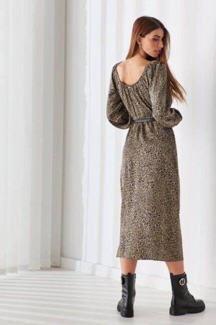 Φόρεμα σατέν. Σταθερό ύφασμα εμπριμέ. Ίσια γραμμή με άνετη εφαρμογή. Κλείνει με κουμπιά εμπρός. Λάστιχο στο ντεκολτέ και στα μανίκια. Ζώνη στην μέση. Άνοίγματα στην φούστα. Το μοντέλο είναι 1.80 και φοράει small.